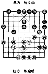 如(图),是1993年全国个人赛陈启明对许文学弈完15回合时的形势。红阵形协调,黑左车右马停在原位未动,巡河炮又潜伏不利因素,红如能抓住时机,持先行之利,可以谋子占优。着法红先: