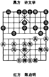 如(图),是1993年全国个人赛陈启明对许文学弈完15回合时的形势。红阵形协调,黑左车右马停在原位未动,巡河炮又潜伏不利因素,红如能抓住时机,持先行之利,可以谋子占优。着法红先: