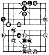 如图开势,红方杨官?U面临着双车一马的反击,局面紧张。红方在防守中不乱木慌,得其法度,最后成为多兵的局势而获胜。红方先行: