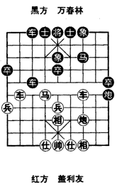 如(图),是1992年全国团体赛盖利友对万春林弈成的中局,轮到黑方走。此时黑用骑河炮牵制了红双车马,而左马被捉正好跃出河口攻击。着法黑先: