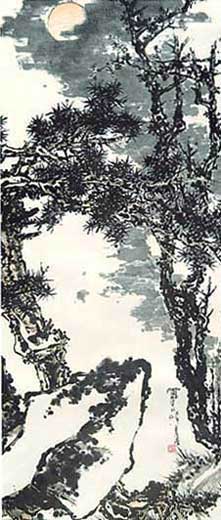 “破险”并非去掉原来的“险”,只是因“破”而使“险”的气势不倒,反而更有力地站着,故觉其奇。刘勰《文心雕龙》说“酌奇而不失其真”(真即贞,正也)。潘老“造险”“破险”,可谓深谙此理。“山穷水复疑无路”,似乎到此无路可通了,然而“柳暗花明又一村”,眼前却别有天地,使人胸襟为之一豁。读潘老的画,也有这种感受。试举一例略加说明:《梅月松石》,是一幅丈二的水墨指画,它的特点是平中见奇,左边松石,右边梅花,当中一轮明月高照,题材是常画的,构图略如“品”字,似亦甚平,平则易板,又因描写夜景,全图基调为黑色,“板”与“黑”正是“险”处,其破之法,关键在于“明月”与“行云”之巧妙,以水墨画之,自上横扫而下,一气呵成,使与松梅取得联系,与直干成了交叉。月开云路,有掩映运行之态,显得气韵极生动。以浓墨画老梅,干如铁铸,梅后衬云,以浓破淡,浓淡分明,并与前面峻增之松石,各具空间感。加以皓月当空,以白守黑,形成强烈的对照,构成“涛声破梦铁骨冷”,“风来云去月当头”的诗境,写出了夜深的静穆萧森之气,咄咄逼人。这幅画左松右梅,添月成三,而以月为主,月光一照,黑气尽散,化暗为明,衬以行云,元气淋漓,化板为活,化零为整,不题诗而诗意自浓,此应为潘老的指墨画中一幅杰出的作品。