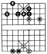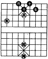 注:①车兵对车双士,一般是和棋。本局红方针对黑车位置不利,借势运兵追将入局,是获胜的唯一途径。