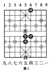 黑方如能走成二卒在后,一卒在前的小集团阵形(如图2),是可以守和单车的。防守要点:用前卒盯住老帅,使其助攻作用削弱。