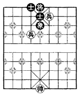 双兵本来难胜单缺象,似此局形势,红有一兵控制将门,帅占中牵制士象,高兵正好借机调至右翼袭击黑方空门。如图,红先胜: