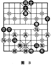 如图B,黑方献马卧槽,红如炮六平三,则车8退1得车胜。红如车二平三,则炮6平3,仕五退四,车8平6,帅五平四,马3进4成“马后炮”绝杀黑胜。