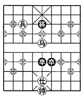马低兵对双高卒,二线兵低头无法控制黑将,则为官和,本局为三线兵,虽属低兵范畴,但因黑方无士,兵在马的支援下能禁控黑将,故为必胜残局。
