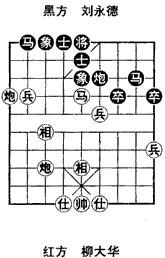 此局选自第二届亚洲杯象棋赛湖北柳大华与澳门刘永德的对局。如图形势。红局势占优。但如何获胜?实战中,红抓住黑2路马的弱点,巧施攻王与得子的战术,迅速入局。