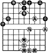 如图所示,红方有一兵过河,形势比较有利,如何更有效的打击对方,是目前的紧要时刻。红方针对黑马位置不好的时机,采取了细腻的控制手法,终于谋子而胜。红方先行: