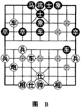 如(图B)形势,红方双车一炮集中在黑方右翼,形成局部子力优势。如何将优势转化为胜势,红方双车在炮的配合下攻破黑方防线,请看以下着法。