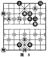 如图B ,红方连弃二车,首着弃车塞黑象眼蹩住马腿,一箭双雕,末后马炮双将胜。