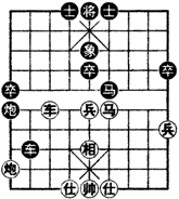 如图所示,双方实力大体相当,但由于黑方子力占位较好,容易展开攻势,形势比较有利。黑方经过审度形势后,巧运河口马捉车,攻击相当紧凑及时,终于获取了优势。黑方先行: