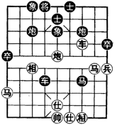 如图形势,黑方杨官?U各子比较活跃,但一时还没有什么攻击手段。如果利用进边卒的方法威胁对方,则效果较为缓慢,红方可以从容展开攻防,黑方经过仔细地审度局势,断然回中象弃左炮,采取中路强攻,终于快速地取得了胜势,黑方先行: