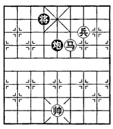 本局的取胜方法与上局大致相同,只是在兵进宫心前需运帅腾挪,避开黑炮锋芒,以兵逼炮离开王位即可达到兵定宫心锁将的胜形。以下各局如遇此“定式”胜形,在解中均不再叙述其变