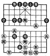如图形势红方杨官?U虽然有空头炮的优势,但黑方可以进将,以下可以施展平将要杀的手段,形势非常紧张。在此紧要关头,红平兵弃炮,随即助道兑车,走出了两步精彩的妙手,终于发挥了四路兵的威力,取得了优势,红方先行: