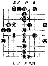 当棋杆上出现图形势时,年轻的安徽象棋大师许波只感到一阵轻松。高潮过去了,红方仅多一中兵,下一手只要炮7进3兑炮,和局已定。在六届运动会中,在主力台次上能和特级大师平分秋色,能不高兴吗?这是1987年六届全运会象棋团体预赛李来群――许波弈完24回合形势。许波还未从遐想中回过神来,红方已经动子:
