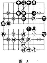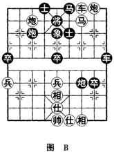(图A)。双方子力完全相等,子力占位亦难说优劣。然红方心细如发,抓住黑方底象受牵制的弱点,妙渡三兵,继而巧妙运马扑槽“马后炮”一举获胜,实战着法如下: