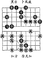 1987年六届全运会福州国体赛徐天红――卜风波弈至16回合红定炮八平四形成如图之势,红方平炮的目的明是解杀,暗伏炮退仕角之凶着,黑方的双车无法移动,看来夺车在即,红方形势大好,不想,黑方出其不意地来了个马踏达兵: