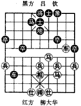 如图所示,黑方车炮牵制着红方中路,但由于红方有马防守,一时似乎难于攻破红方的阵地。黑方在此时刻,走出了献马取势的妙手,终于扩大了优势。黑方先行: