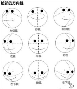 OK!正面的脸部已经刻画好了,大多数情况下光有正面的脸形还是不够的,还需要为人物制作出不同位置时的脸形,我大概总结了一下(如图9)!