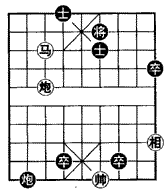 如图所示,红方马炮对黑方炮三卒双士,局面难分优劣。而黑方双卒已逼进九宫,红方有潜在的危险,必须在黑方成杀之前,运用马炮灵活的特点,先发制人,才能取胜。