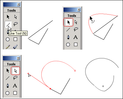 1.打开Flash MX软件,在工具栏中使用线条工具,绘制三个线段,呈倒三角状,然后使用箭头工具将线条拖出一定的弧度,再使用第二箭头工具,也就是贝塞尔工具拖动弧线的顶点。完成后如图1所示,这就是人物脸部的简单轮廓。
