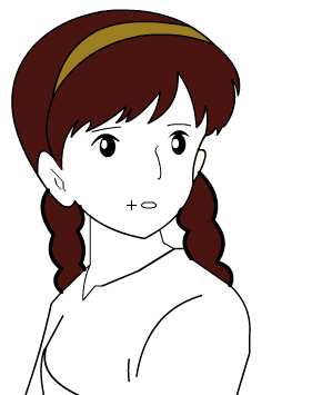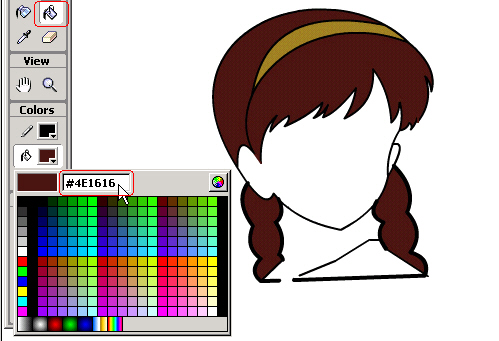 3.使用油漆桶工具在头发中填充棕色#4E1616,通过进一步的修饰,强调人物的形象。在对发辫的绘制中尽量使线条粗一些,使发辫看起来更硬朗。填充时请注意,必须使用封闭路径,也就是说,填充物的内部要使线条完全封闭,没有空隙。