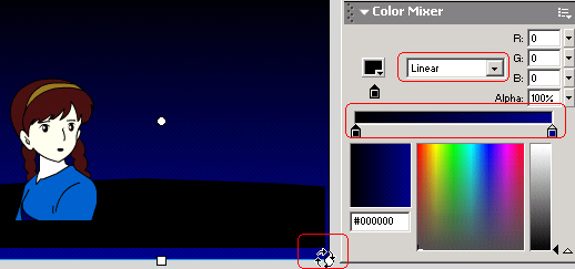 6.在场景中新建一个图层,绘制一个矩形,在Color Mixer面板中,使色彩用Linear渐变方式填充,渐变两端的色彩分别为黑色和深蓝色,然后使用渐变调整工具调整渐变的填充方向,使人物背景充满夜空的深度。