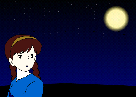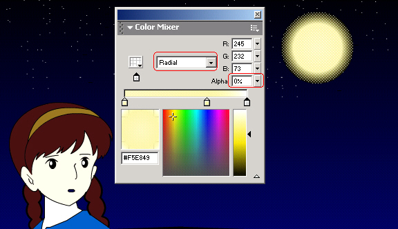 7.使用圆形绘图工具绘制一个无边框的圆形。使用radial放射性渐变填充方式,色彩依次为黄色-黄色-白色。将最顶端的白色透明度降为最低,也就是Alpha值为0,使色彩有一个向外扩散的渐变方式,绘制出月亮。然后绘制一些白色的小圆点来充当星星,这样,一个简单的Flash MV构图就制作完了。