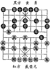 黄勇在1983年全国个人赛中,以三步虎转半途列炮的阵法迎战载荣光的五九炮,战至8回合成如图形势,除红万多进了一步中兵外。棋形对称,虽然双方还未响枪,却是一个一触即发的山而欲来风满楼的紧张局势。在这决定以后变化由谁