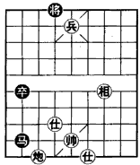 如图形势,红兵已入花心,红炮叫将即可获胜。但黑马严格控制红炮,又有卒可走闲着,似乎已成和局。然而红方巧妙利用黑方马卒位置的弱点,使其自相倾轧,而乘隙击之。(红先)