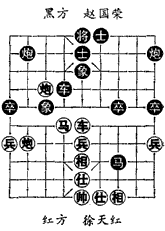 1987年南北国手对抗赛徐天红――赵国荣弈至50回 轮黑走子的形势如图,双方子力相等,而黑要防止红左炮两处打车的抢先手段。黑方考虑良久,决定采取快步打车的办法制住红方移炮打车,从而兑子抢先: