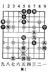 图2是吕钦与于幼华二位特大所弈成的“后中局”形势。黑方有中炮镇住当头,而红方有兵渡河作战,子力相当,各有千秋。素来惯于“浪”战,有“拼命三郎”雅号的于幼华突然挥炮破仕,抢攻在先,利用“缺士怕双车”的弈理,猛烈攻击,最终获胜。