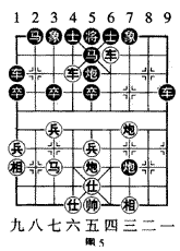 图5是“昆化杯”大师邀请赛中,胡荣华与赵国荣二位特级大师所弈成的形势。黑方大子齐全,却有窝心马的弱点;红方只少一马,却有双肋车的优势。如果红方急于出帅催杀,则黑方可走炮5平6喂炮阻隔,且伏有车9平6兑车解围之着,红方自添麻烦。实战中,红方首先弃车破士,从容攻杀,杀法如行云流水,一气呵成。