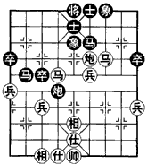 如图B,红马再扑卧槽,黑如欲不丢子必走士6进5,而红帅早已在肋道等候多时,黑推枰认负。