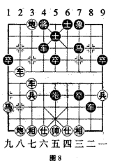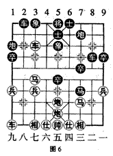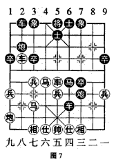 图7是由五九炮炮打中兵对屏风马演变而成。从表面看红方阵形整齐,右翼虽有空虚之感,但边炮在防卫二路线,黑方似乎难有进犯之机,可是只要稍加推敲,就会发现红方潜在的致命弱点。