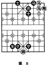 如(图B),红方“马后炮”胜。纵观此局不难看出,临局马炮聚集一处,往往隐藏有马后炮杀法,棋手当仔细研磨,不使良机错过。