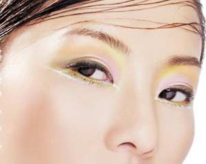 同色系的黄色眼影使用后,在凸出的眉骨打上白色眼影,突出眉骨高度,相对眼窝看起来就深邃些,用亮黄色的金属质感眼影沿下睫毛根部抹过,呼应眼窝的色彩。下眼睑常出现黑眼圈的位置,用白色膏质眼影画出眼头和飘逸的下眼线,这是妆容的重点。