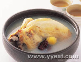 (5) 在大钵子或石碗中盛鸡和汤。配以盐﹑胡椒粉。吃的时候﹐将捆的线剪断﹐并把放在鸡肚里的材料取出与鸡肉一起吃。休 闲 居编 辑