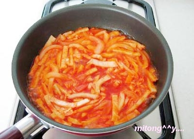 煮至水滚加上适量的韩式辣椒醬,我的韩式辣椒醬是帶甜味的。所以不需再加糖,如果用的是原味的韩式辣椒醬就要加糖唷:) 因為辣炒年糕吃起來要甜甜辣辣的才好吃!