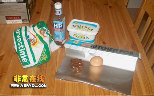 材料除了自己爱吃的调料和鸡蛋外,就是一个用硬币制作的导热器和铝箔制作的小煎锅一个。