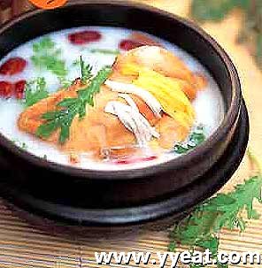 2.砂锅加水,烧开后将童子鸡放入砂锅中,加大枣、高丽参炖到鸡肉与鸡骨分开为止。