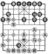 如图,红方出动左车捉马,不愁友马被歼,抢先佳着。至此,黑方右马疲于奔命,浪费步数,而红方则在追击之中,出动子力,占尽优势。