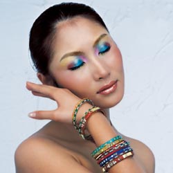 妆面特点:整体感觉十分艳丽,紫色、绿色、粉色在这一系列里大行其道,三种颜色的混合使整体效果更加魅惑。眼影选择多种颜色相组合,制造出一种迷离感,加上珠光做点缀,使眼部更加富有魅力。腮红选用相对柔和的桃粉,给面部制造出红润感,嘴唇可以选用中性的粉色或相对艳丽的玫红,这样可以突显唇部的饱满。