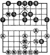 〔棋例3〕1984年全国团体赛,河北黄勇对甘肃王秀子弈至第18回合时的形势如图。双方以士角炮对中炮布局。目前双方各控制一翼,红方多兵。如按常规走法,黑方势必凶多吉少。此时,黑方妙演“以逸待劳”之计,弃马升炮,取得优势。实战着法如下: