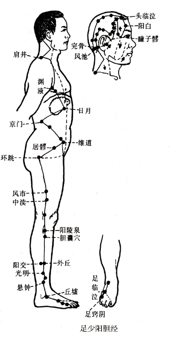 [本经穴]瞳子髎、听会、上关、颔厌、悬颅、悬厘、曲鬓、率谷、天冲、浮白、头窍阴、完骨、本神、阳白、头临泣、目窗、正营、承灵、脑空、风池、肩井、渊腋、辄筋、日月(胆募)、京门、带脉、五枢、维道、居髎、环跳、风市、中渎、膝阳关、阳陵泉(合)、阳交、外丘(郄)、光明(络)、阳辅(经)、悬钟、丘墟(原)、足临泣(输)、地五会、侠溪(荥)、足窍阴(井)。