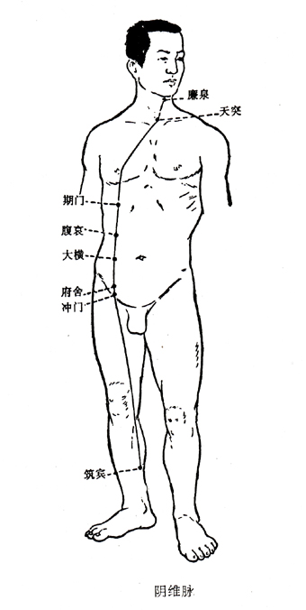 [交会穴]筑宾(郄;足少阴),冲门、府舍、大横、腹哀(足太阴),期门(足厥阴),天突、廉泉(任脉)。此外,手厥阴心包经的内关穴通于阴维。