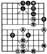 如图形势,从局面来看,黑方少一象处劣势。黑方如何利用先手转危为安呢?这得从红方子力位置的弱点找突破口,得出相应攻着。红方三路车马受牵制是黑方可利用的机会。