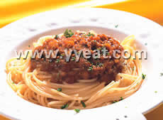 (3)义大利面煮熟后放在盘上,再将肉酱淋上,最后撒上少许巴西里末即可。