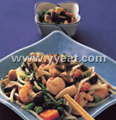 (3)起油锅爆香蒜末,再依序放入虾仁、青豆仁、红萝蔔丁、油菜花菇蕈泡菜及调味料拌炒片刻,最后加入豆芽菜炒熟,至所有材料全熟入味后即可盛盘。