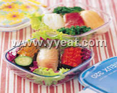 (4)先将生菜、紫生菜排入经由冷冻结冻过的保鲜盒中,再将做好的生鱼片寿司3个放入;取另一冷冻保鲜盒,亦先将生菜排入,再放入剩下的3个生鱼片寿司及绿花椰菜,酱油可用经济小铝包或小盒装,便当就大功告成了。
